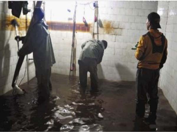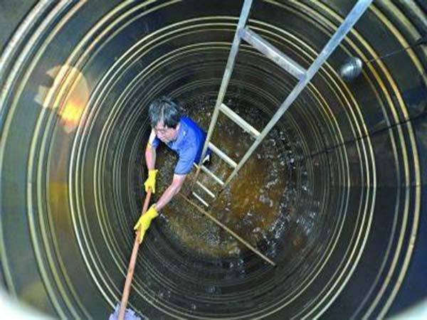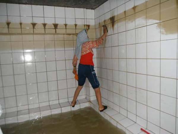 2、先用扫把,从塔壁到塔底认真往下刷,因为刷起来水会变得浑浊,所以需要定个顺序,从左往右从上到下,尽量不要有遗漏的。