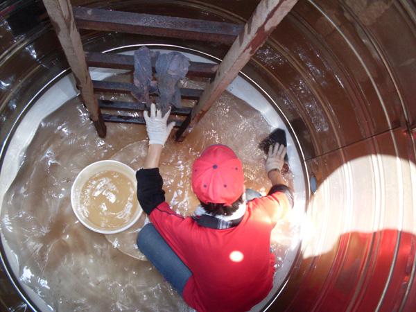 3、感觉洗得差不多了就可以放水了,出水阀在水塔底下,一般开关转一下就好了,可是小编怎么也转不动,估计生锈了,索性把出水阀整个拆下来,一会缠上白胶布重新装上就好了。放的时候把水搅一搅,带走脏东西。一塔的水,出来的压力也是挺大的。